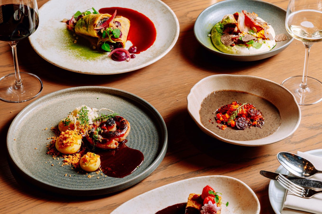Hlavní chody vzdávají hold ikonickým vánočním chutím. Vinná klobása s okurkovým gelem, kysaným zelím a uzenou bramborovou kaší představuje moderní interpretaci klasického stánku a pomyslný symbol českého svátečního stolování se objevuje jako trhané kachní maso s lokšemi, pyré z červeného zelí a kachními škvarky.