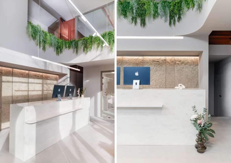V MILES se pracuje s emocemi klientů ještě před samotným ošetřením. Už vstup do kliniky nastavuje jiný rytmus – čekárna nepůsobí sterilně ani chladně, naopak zve k posezení a krátkému zastavení. Interiér kliniky působí jemně a harmonicky. Oblé linie, teplé tóny béžové a terakoty, minerální panely a velká okna vytvářejí atmosféru, ve které je snadné zpomalit. Tlumené světlo, zeleň či ordinace se stropními obrazovkami s Netflixem pomáhají odvést pozornost od stresu a návštěvu proměnit v příjemný zážitek.