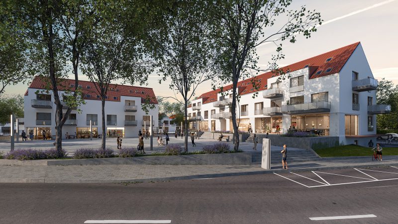 Součástí projektu je nové náměstí, které se stane přirozeným centrem lokality – místem setkávání, obchodů, kaváren a každodenního života obyvatel. Tento veřejný prostor zároveň vytváří důležitou vazbu na okolní zástavbu a dává celé čtvrti jasnou identitu. Projekt je od počátku navržen jako urbanistický celek, kde domy, byty, veřejný prostor i služby tvoří funkční a přirozeně navazující prostředí.